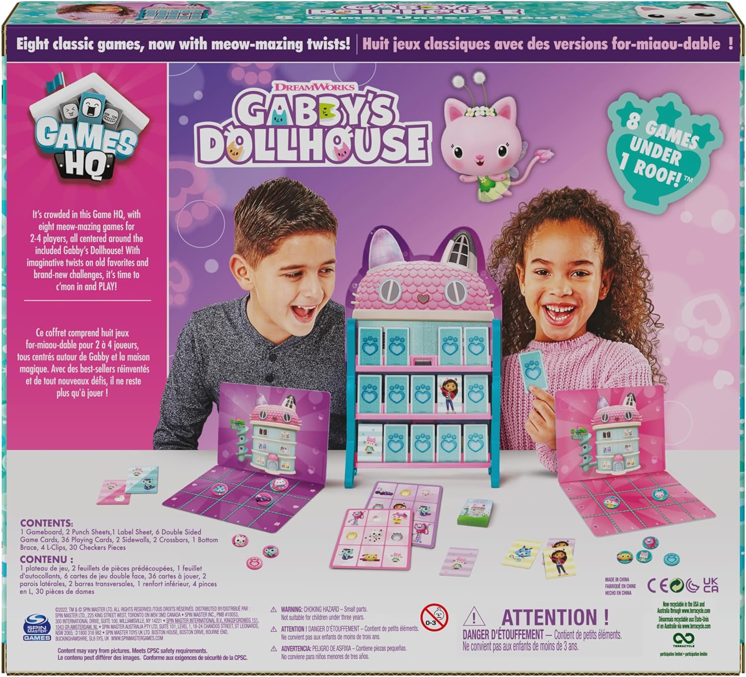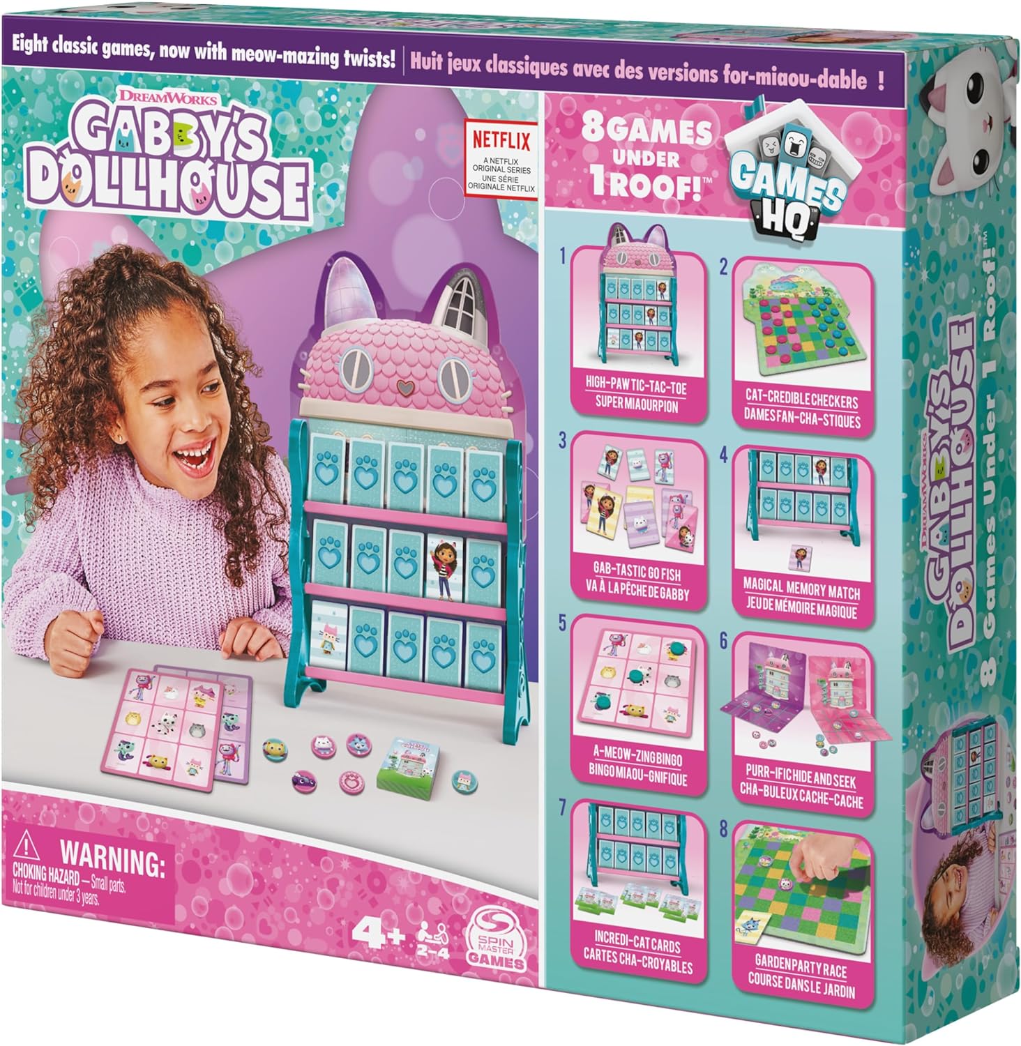 8 Games Under 1 RoofIt’s crowded in this Games HQ, with 8 meow-mazing games all centred around the included Gabby’s Dollhouse. With imaginative twists on classic games, it’s time to come in and play. | Old Faves and New ChallengesHigh-paw tic-tac-toe, Cat-credible checkers, Gab-tastic go fish, Magical memory match, A-meow-zing bingo, Purr-ific hide and seek, Incredi-cat cards and Garden party race. | Based on the NETFLIX ShowIf your kids love Gabby’s Dollhouse toys, look no further for fun board games and card games for girls and boys. This Games HQ is for 2–4 players, for all kids ages 4 and up. | Games IncludeHigh-paw tic-tac-toe, Cat-credible checkers, Gab-tastic go fish, Magical memory match, A-meow-zing bingo, Purr-ific hide and seek, Incredi-cat cards and Garden party race. |